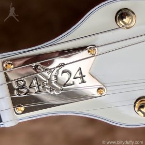 Inspired by my original ‘Sanctuary’ Falcon, the G8424TG features a Vintage White nitrocellulose lacquer finish with gold sparkle binding and gold hardware. We used my favourite custom-wound Black Top™ Filter’Tron™ pickups, and Team BD designed a commemorative “8424” metal truss rod cover that also has the famous Gretsch Falcon logo. Ironically this had never appeared on one of the Falcons I play as usually featues on the pick guard, and I prefer to remove them from my guitars.