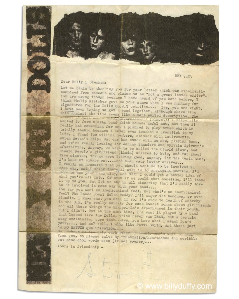 “This is a rather interesting item from my archive… it’s a letter from Stephen Morrissey to me and Stephen "Pommy" Pomfret who was co-conspirator in contacting Moz with the idea of him singing in our band. At the time he ran the UK fan club for the New York Dolls and used their letterheaded paper for the typed-out message.