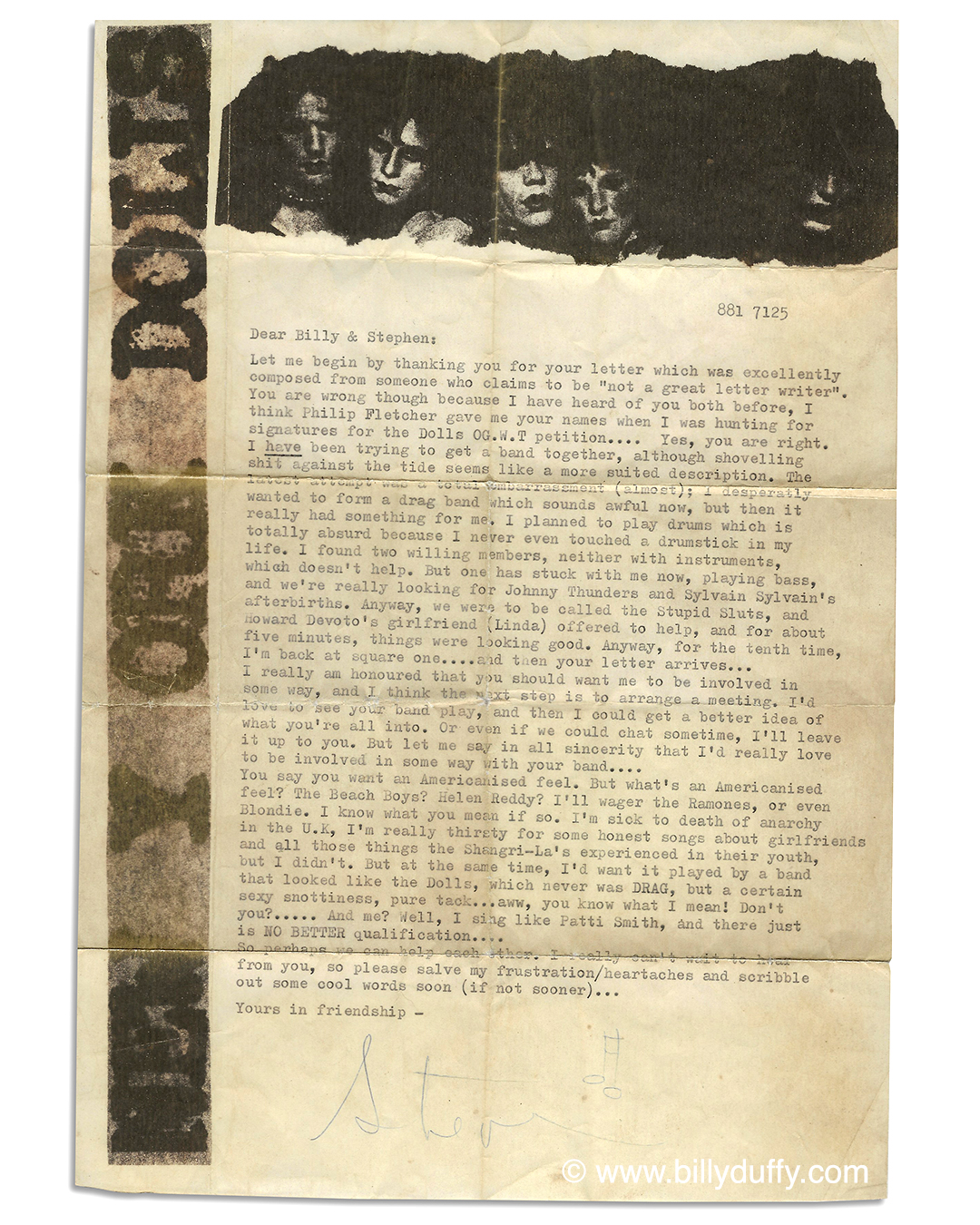 “This is a rather interesting item from my archive… it’s a letter from Stephen Morrissey to me and Stephen "Pommy" Pomfret who was co-conspirator in contacting Moz with the idea of him singing in our band. At the time he ran the UK fan club for the New York Dolls and used their letterheaded paper for the typed-out message.