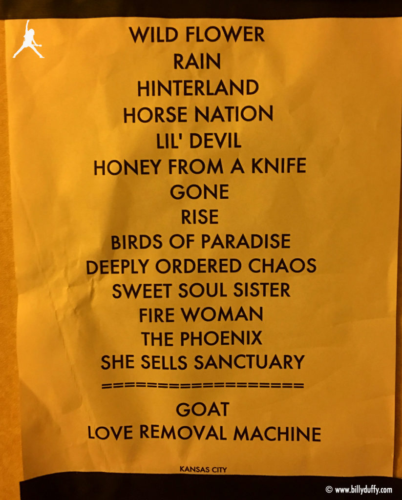 The Cult Set List 29-09-2016 Set ListsPreviousNext Enlarge Tweet The Cult Set List from the 'Alive in the Hidden City' show at Harrah’s – Voodoo Lounge, Kansas City, Missouri on 29th September 2016. Photo by Nancy Allen