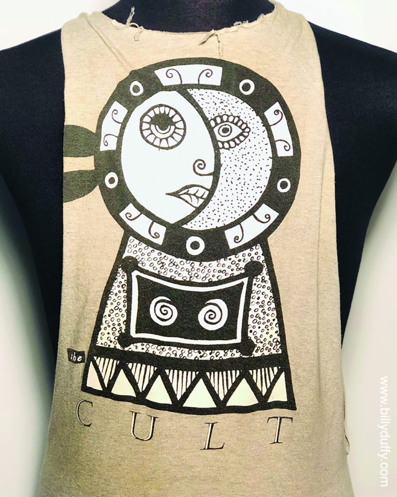 “This was one of the shirts that I wore onstage during the sumer of 1984 before I started wearing more considered stage clothes. At that time, it was the vogue to have “cut off’ sleeves or vest styles plus it suited me as was it was so hot onstage in those small venues. The look was helped by the fact I didn’t eat much too haha!