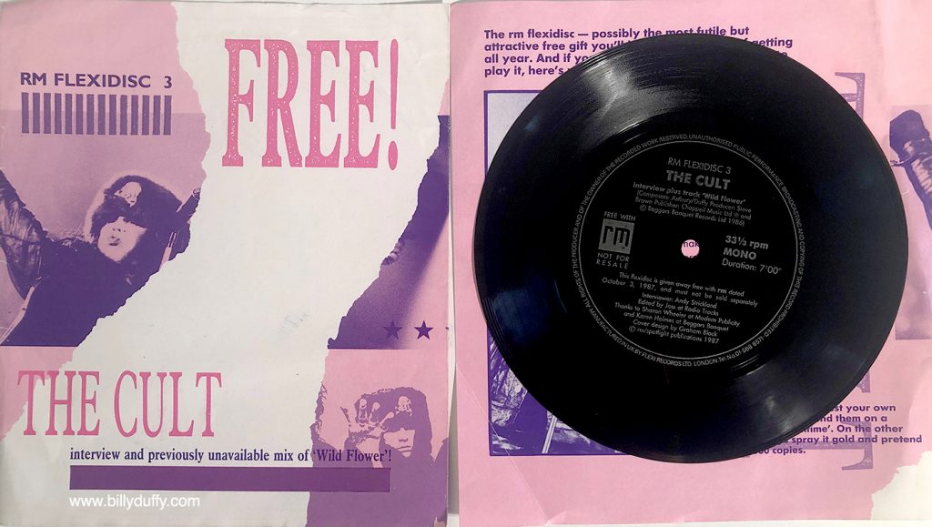 The flexi is single sided 33 ⅓ RPM and featured a version of “Wildflower” plus an extract from the interview with me and Ian that was done by journalist Andy Stickland. The “previously unavailable mix” of “Wildflower” was from the “Manor Sessions” we did with “Love” producer Steve Brown, in 1986, before we rerecorded the whole album with Rick Rubin to be released as “Electric”.”